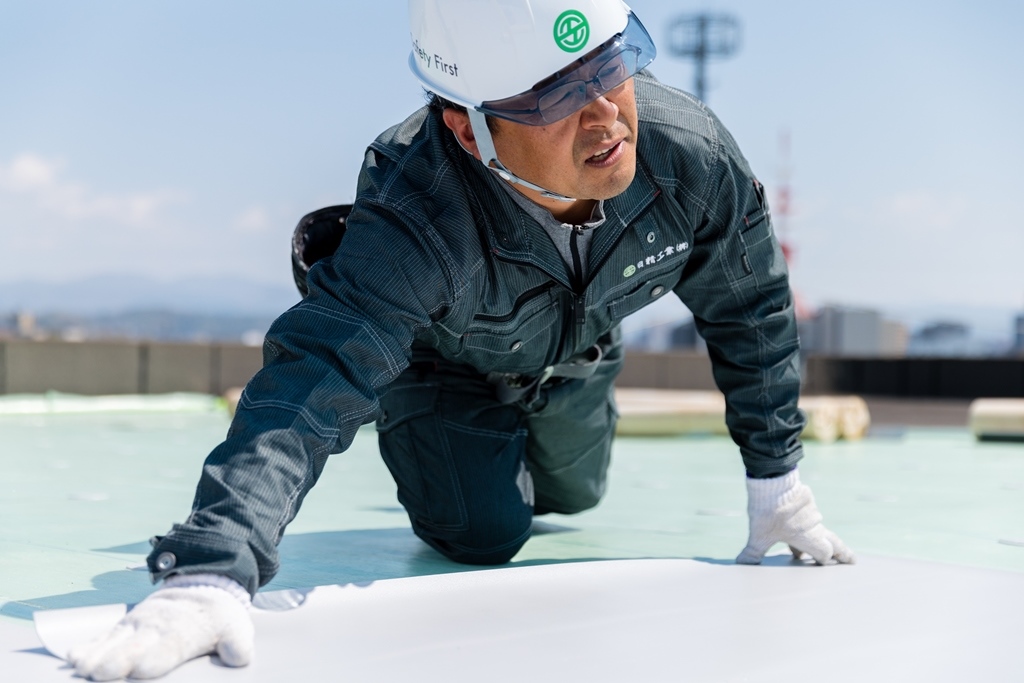 最後に防水層の取り扱い注意事項やメンテナンス事項を記載した、日精工業オリジナル メンテナンス表示シートを貼り付けて完成です。