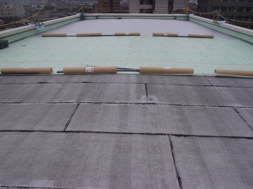 施工中 (塩化ビニル系シート防水 S-M2工法にて防水改修)↓